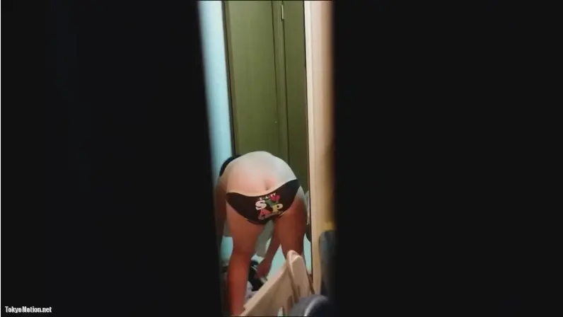 体を拭き終えると、小さなパンティーを装着!!お尻の割れ目が見えてます!
