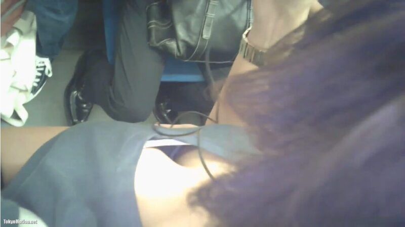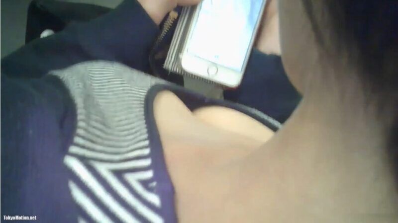 電車でスマホを見ている2人の女性の胸の谷間を背後から盗撮した動画です。